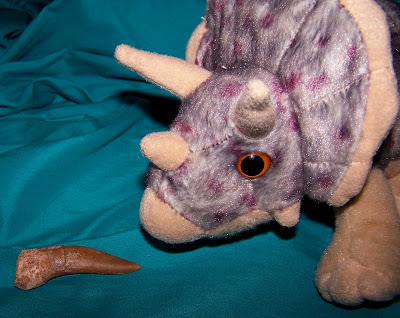 | Pyg checks out the other tooth she purchased at the Denver Gem and Mineral Show, a Squalicorax tooth! |
